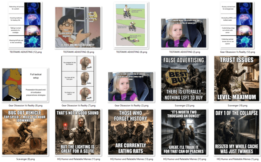A: Not a chance. Every asset—article, meme, image, audio, and video—was created SPECIFICALLY for this bundle by a 26-year prepping veteran and Special Ops retiree. No copy-paste, no “seen-it-before” content.